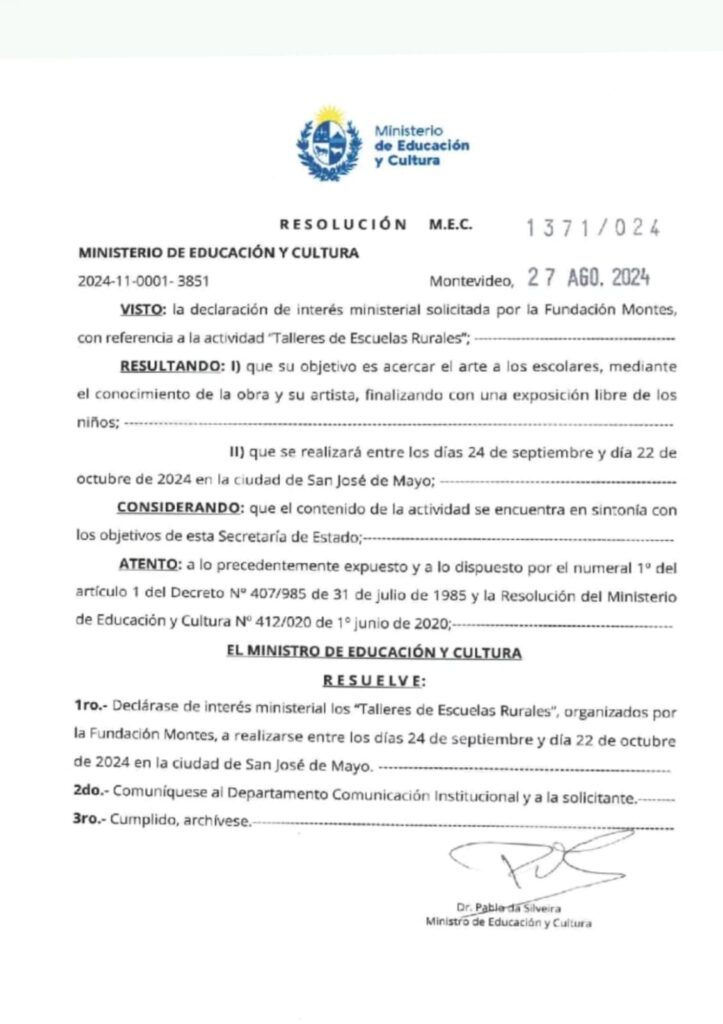 Nuevamente la fundación Montes de arte fue declarada de interés cultural por el Ministerio de Educación y Cultura por llevar el arte a las. Escuelas Rurales del departamento de San José de Mayo