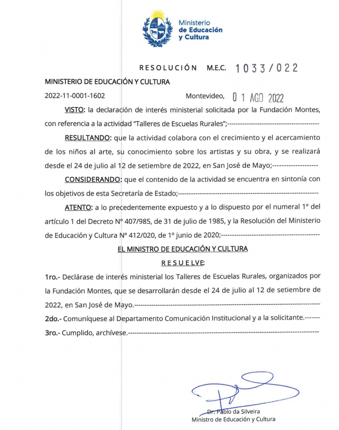 Primer proyecto está orientado en la Escuela Rurales de San José de Mayo, la fundación Montes brindara un taller de carácter Social y cultural a los niños de la escuelas rurales dicho emprendimiento está apoyado por la (ANEP, MEC Y IMSJ) Con apoyo de empresas privadas.